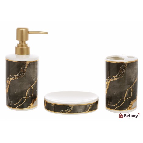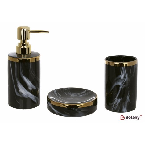 Набор для ванной (3 предмета): дозатор, стакан, мыльница, дизайн – черный мрамор с золотом.