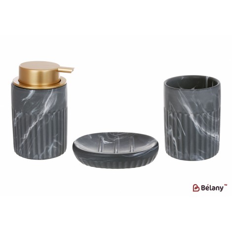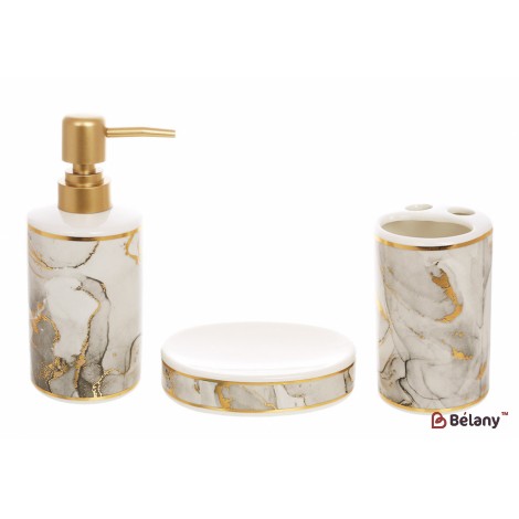 Набор для ванной (3 предмета): дозатор, стакан, мыльница, дизайн – серый мрамор с золотом.