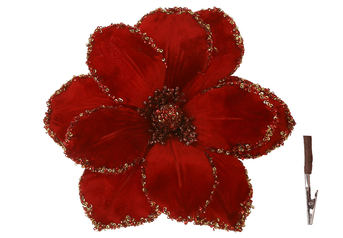 Оксамитова квітка Магнолія на кліпсі з паєтками D28см, колір - червоний з золотом