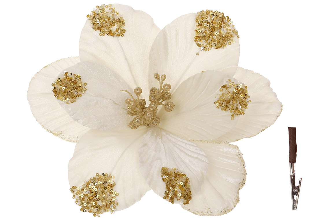 Оксамитова квітка Магнолія на кліпсі в паєтках D28см, колір - кремовий з шампанню