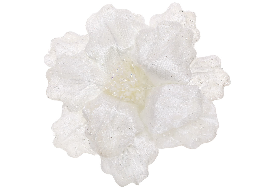 Оксамитова квітка Магнолія з декором з бісеру 21см, колір - білий