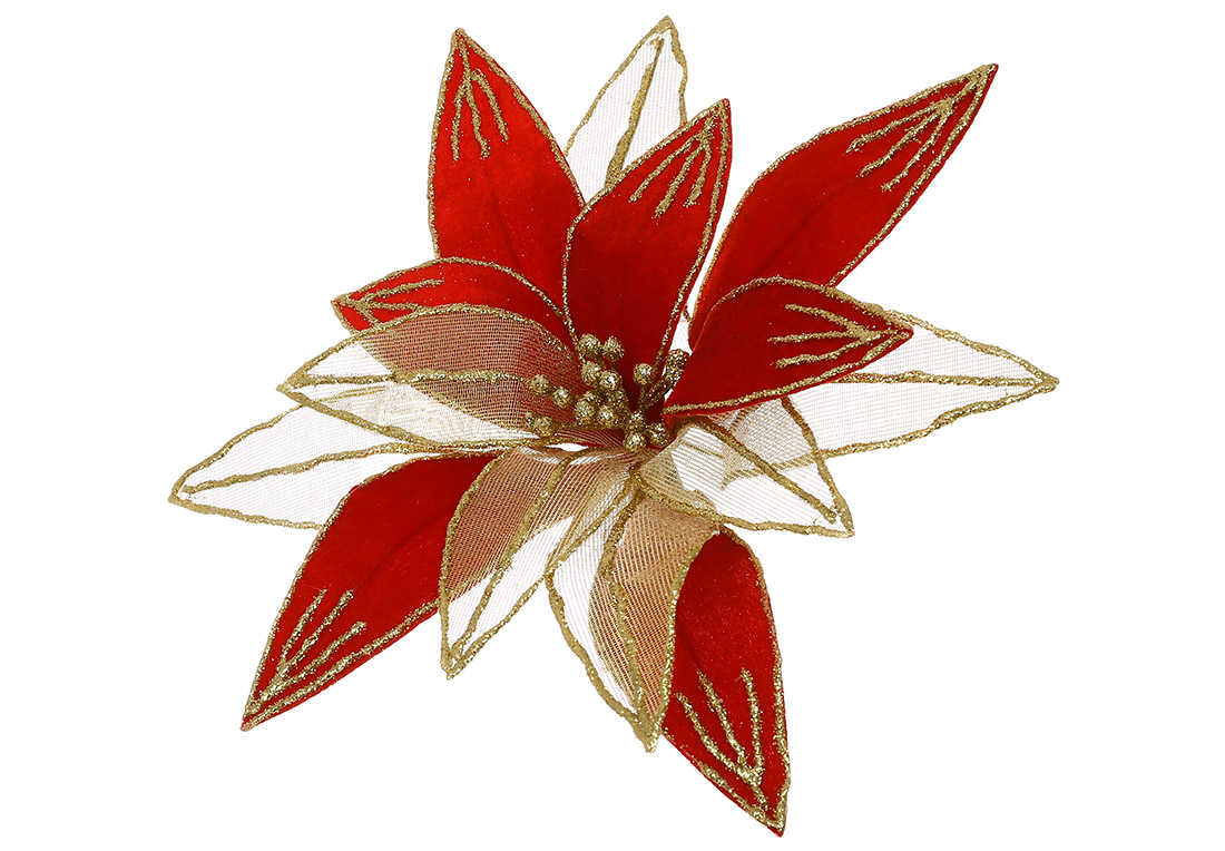 Квітка Пуансетія з оксамиту та органзи з гліттером 34см, колір - червоний із золотом