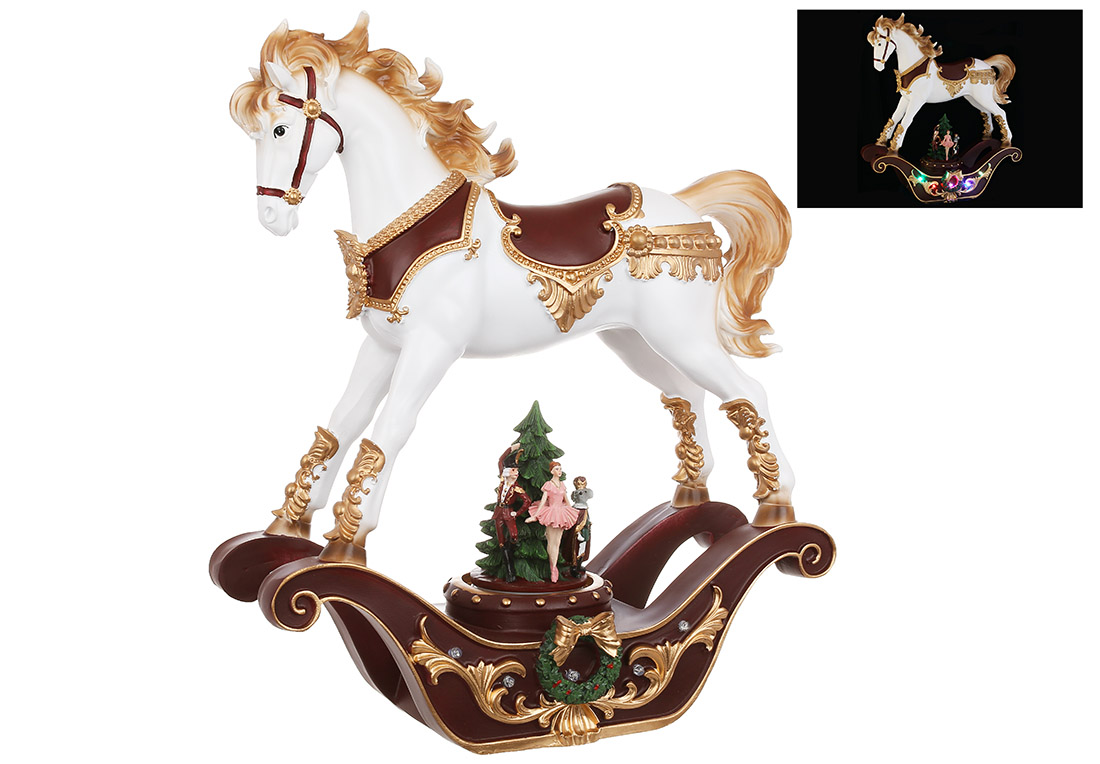Декоративна фігура Конячка-гойдалка з LED підсвічуванням і музичною ялинкою яка обертається, на батарейках (3*AA), 37см