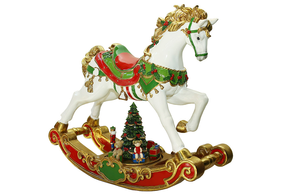 Декоративна фігура Конячка-гойдалка з LED підсвічуванням і музичною ялинкою яка обертається, на батарейках (3*AA), 57см