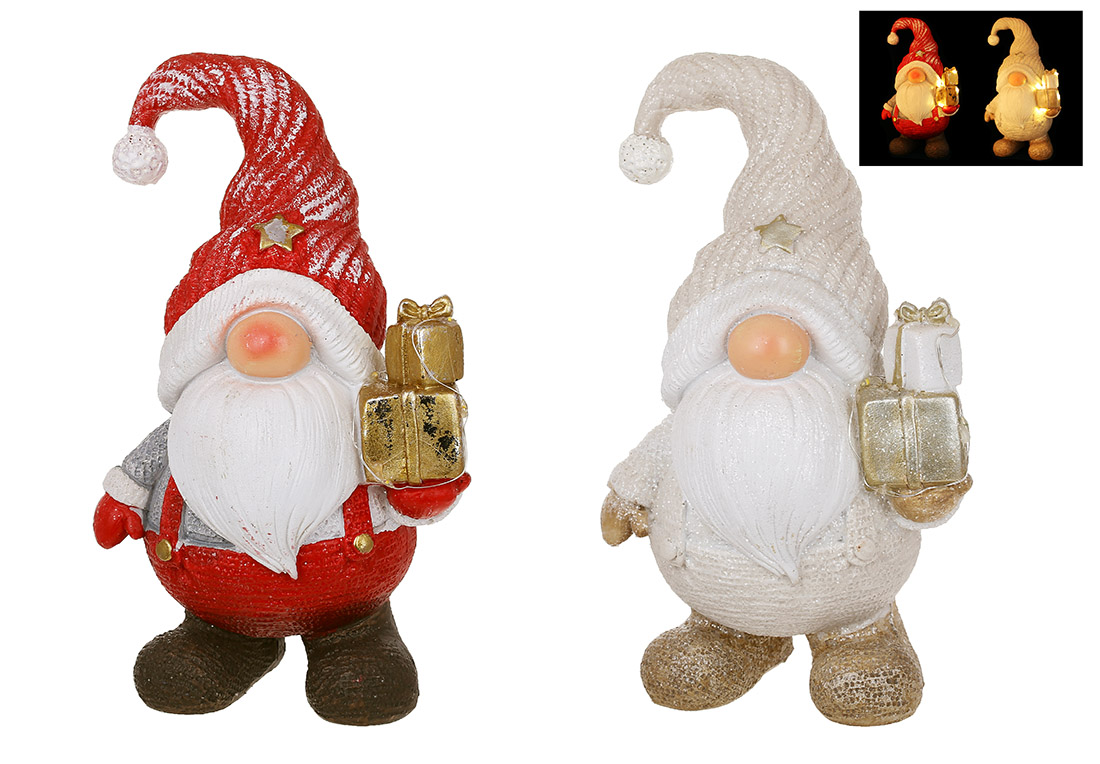 Декоративна фігура з LED підсвічуванням Гном з подарунками в гліттері 23.5см, 2 дизайни, колір - червоний з бежевим