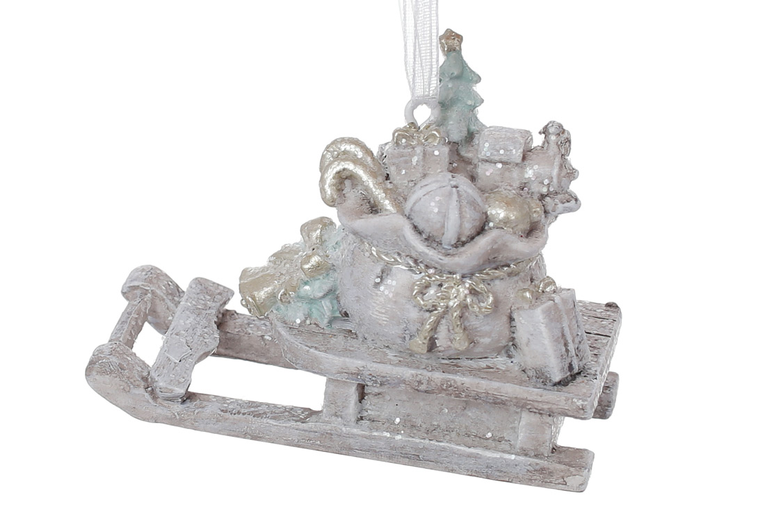 Декоративна фігурка на підвісі Санки з подарунками, 7.5см, колір - сірий з шампанню та м'ятою