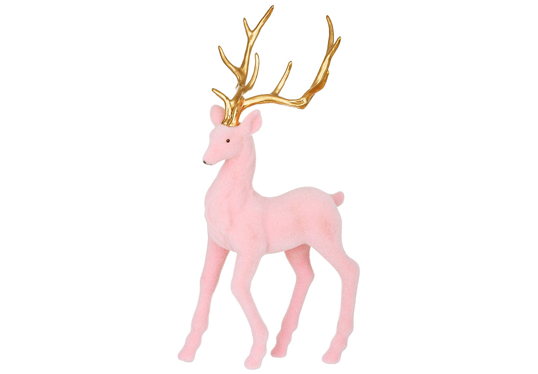 Декоративна флокова фігура Олень 32.5см, колір - рожевий із золотими рогами