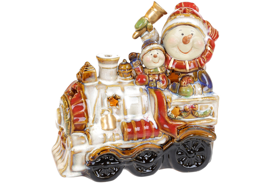Декоративна керамічна статуетка Сніговики на паровозі, з LED підсвічуванням, 18см