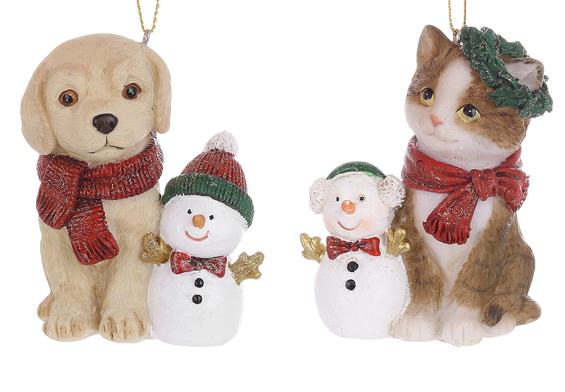 Декоративна підвіска Кіт та Собака зі сніговиками 7*6*9см, 2 дизайну, колір - коричневий з червоним