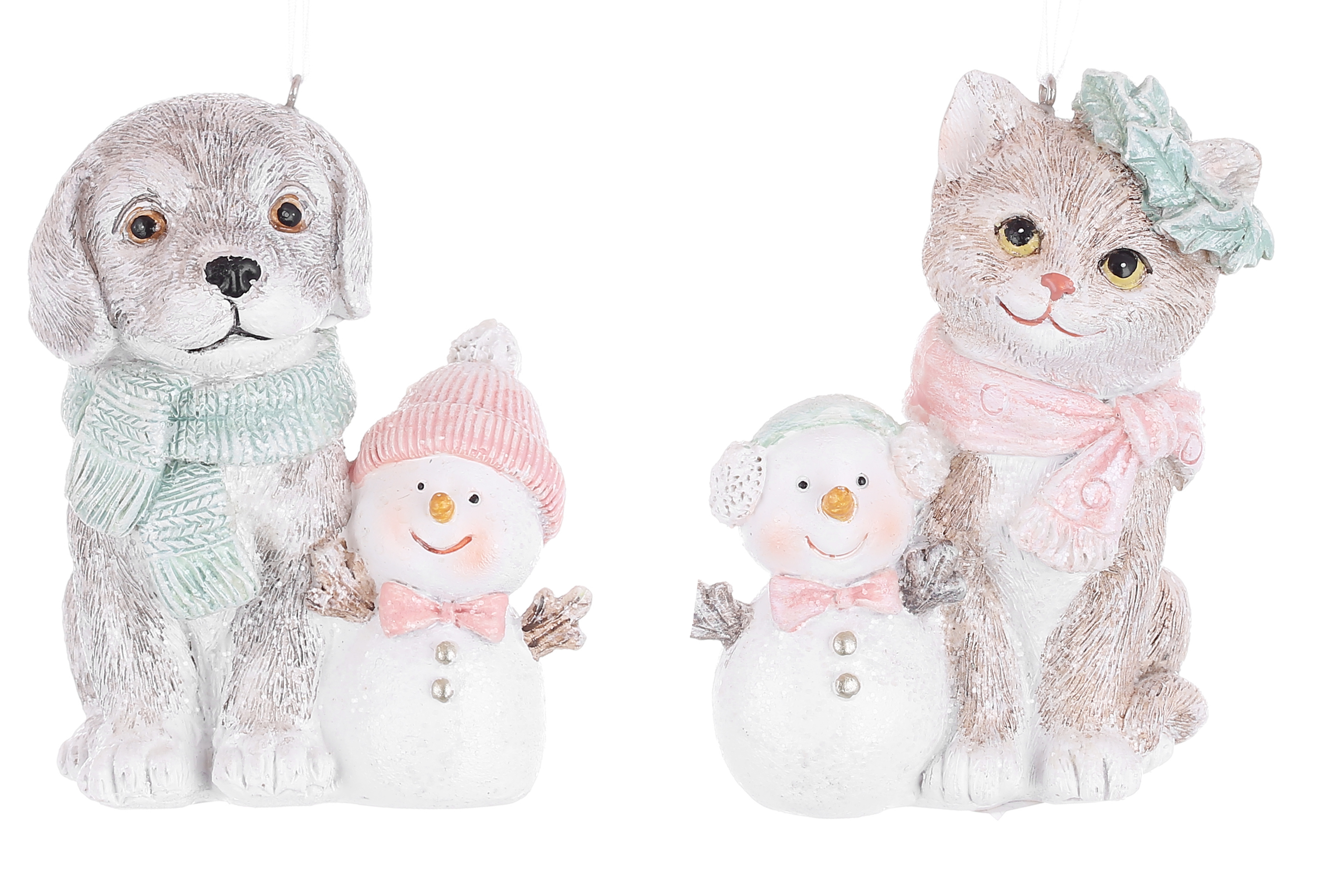 Декоративна підвіска Кіт та Собака зі сніговиками 7*6*9см, 2 дизайни, колір - сірий з бежевим