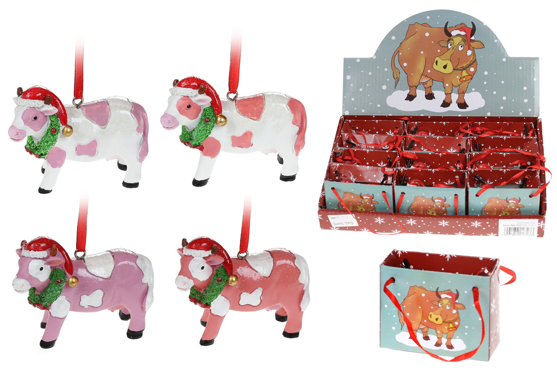 Декоративна підвісна фігурка Новорічна Корівка, 7см, 4 дизайни, колір - рожевий, персик з білим