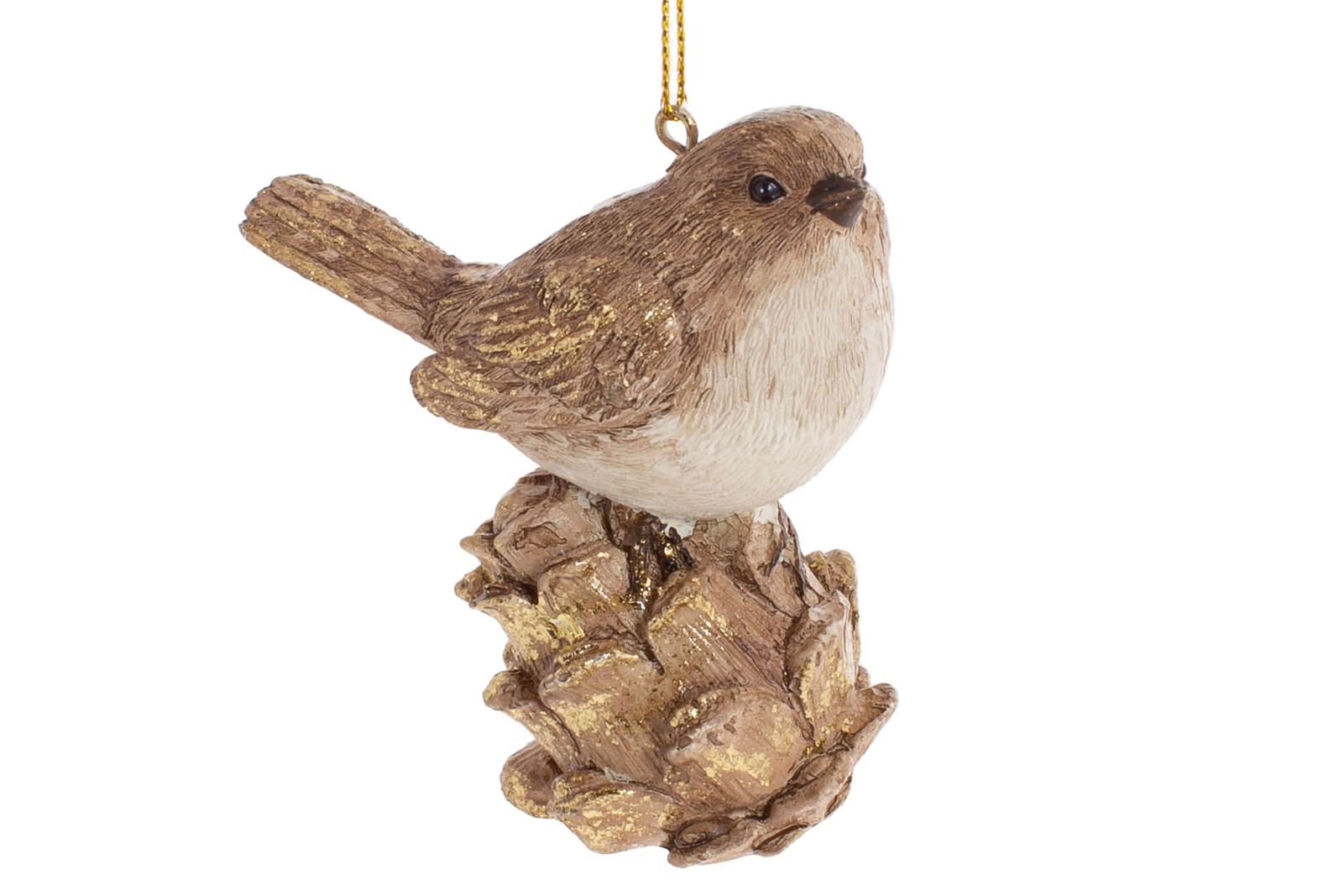 Декоративна підвісна фігурка Пташка на шишці, 7,5см, колір коричневий із золотом
