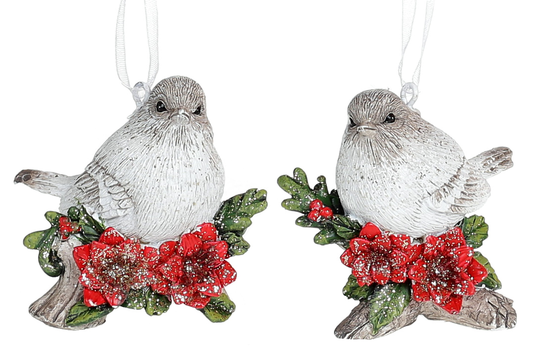 Декоративна підвісна фігурка Пташка в квітах, 6см, 2 дизайни, колір - білий вінтажний з червоним