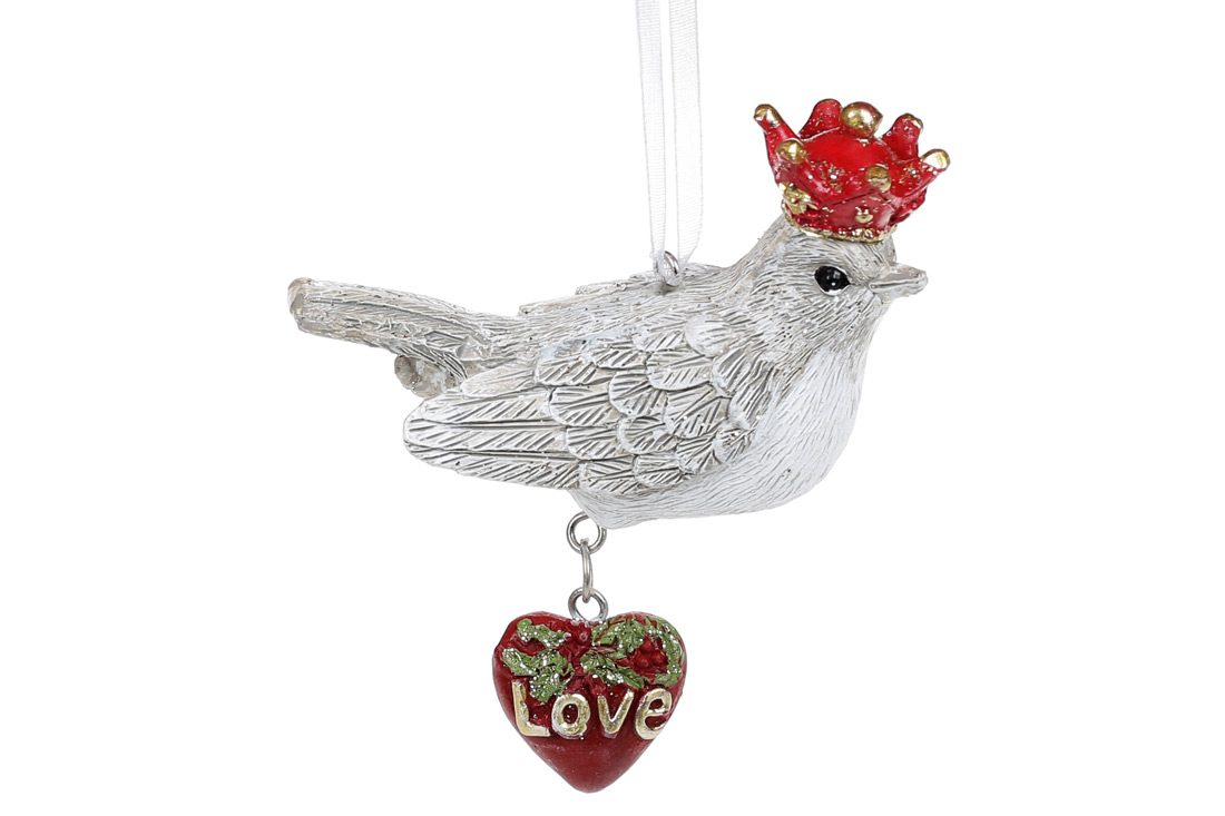 Декоративна підвісна фігурка Пташка в короні, 10см, колір - вінтажний білий з червоним