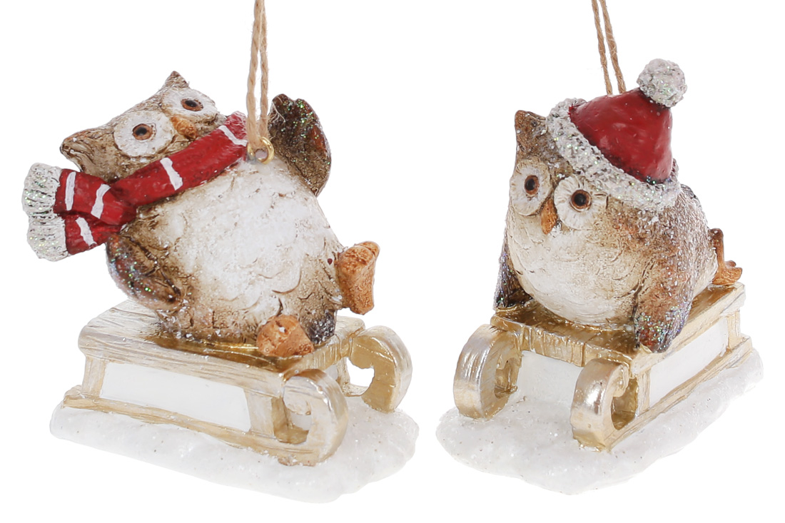 Декоративна підвісна фігурка Совушка на санчатах, 9см, 2 дизайни, колір - білий з коричневим