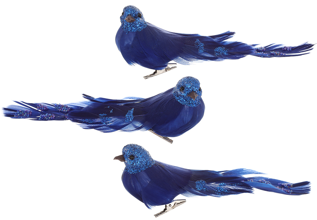 Декоративний птах на кліпсі 18см з декором з бусин та гліттера, 3 дизайни, колір - блюмарин