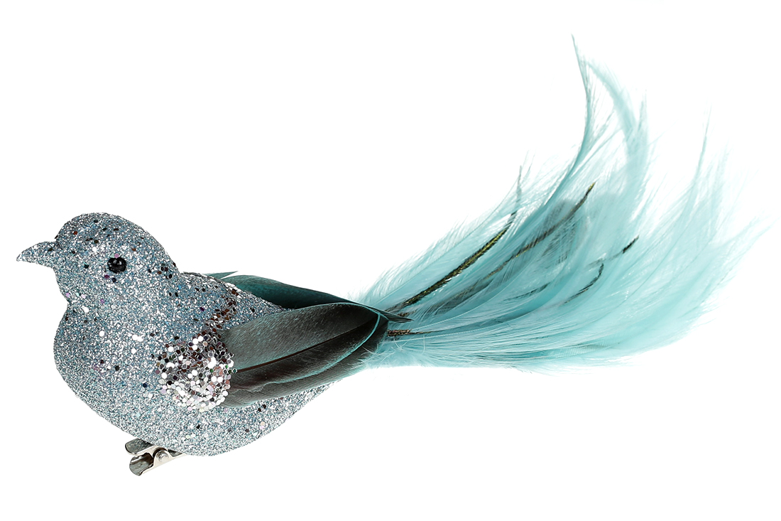 Декоративний птах на кліпсі 20см, колір - м'ятно-бірюзовий