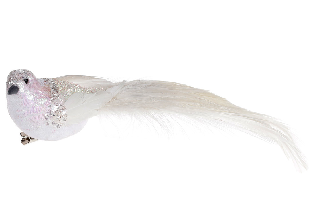Декоративний птах на кліпсі 21см, колір - діамантовий білий