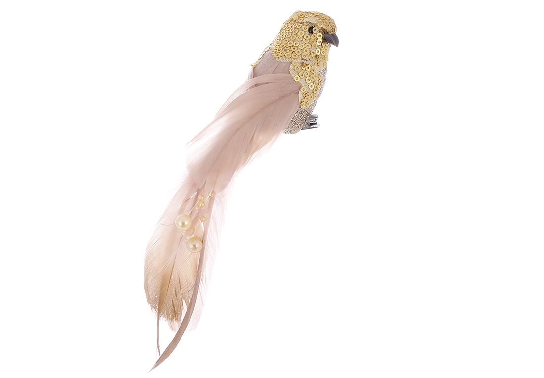 Декоративний птах на кліпсі 22см з декором з паєток і намистин, колір - золотистий шампань
