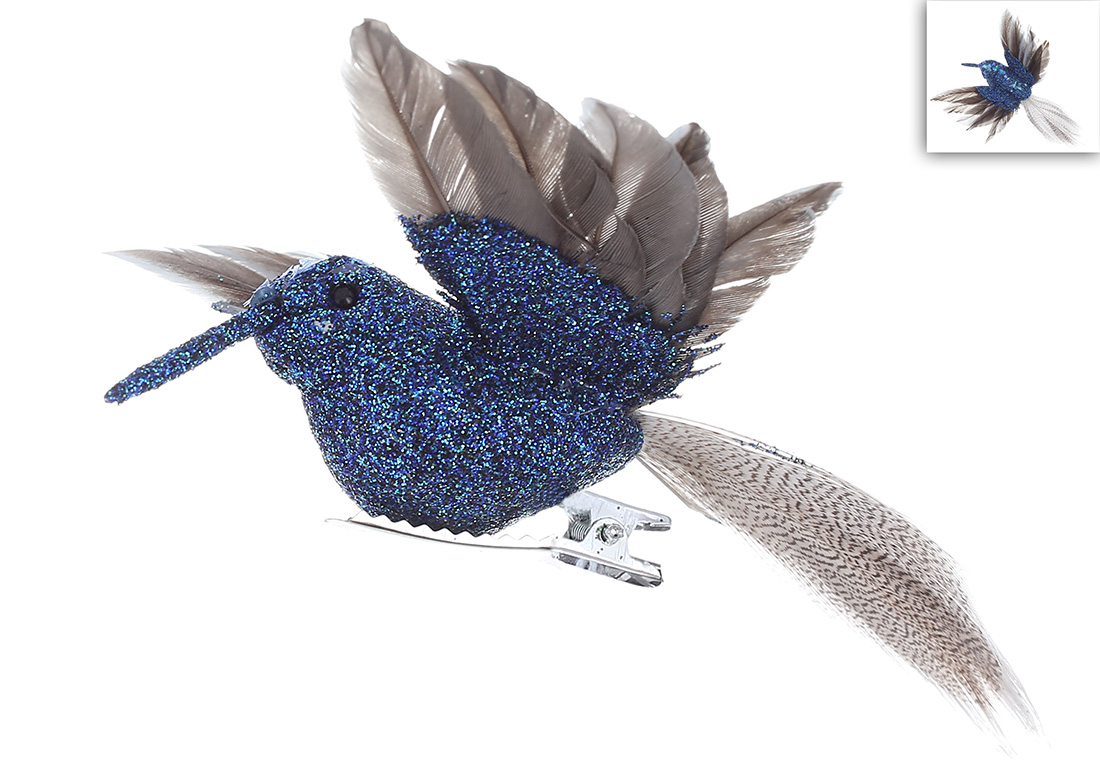 Декоративний птах на кліпсі Колібрі 11,5 см, колір - глибокий синій