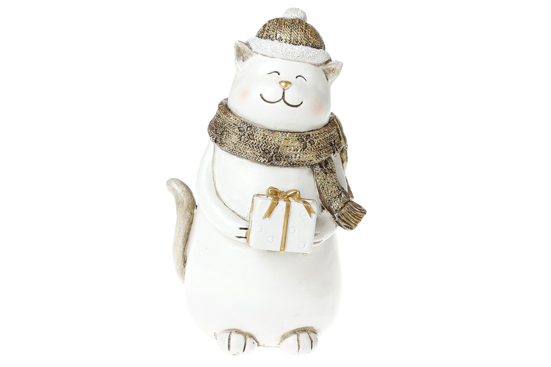 Декоративна статуетка Котик із подарунком, 22см, колір - білий із золотом