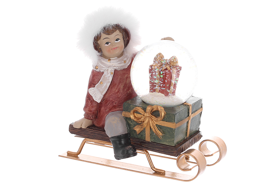 Декоративна статуетка з водяною кулею Хлопчик на санчатах з подарунками 10.5х11см