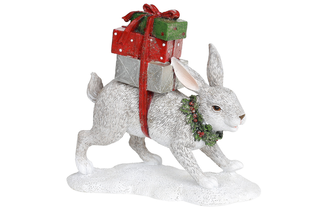 Декоративна статуетка Заєць з подарунками, 19.5см, колір - білий вінтажний з червоним