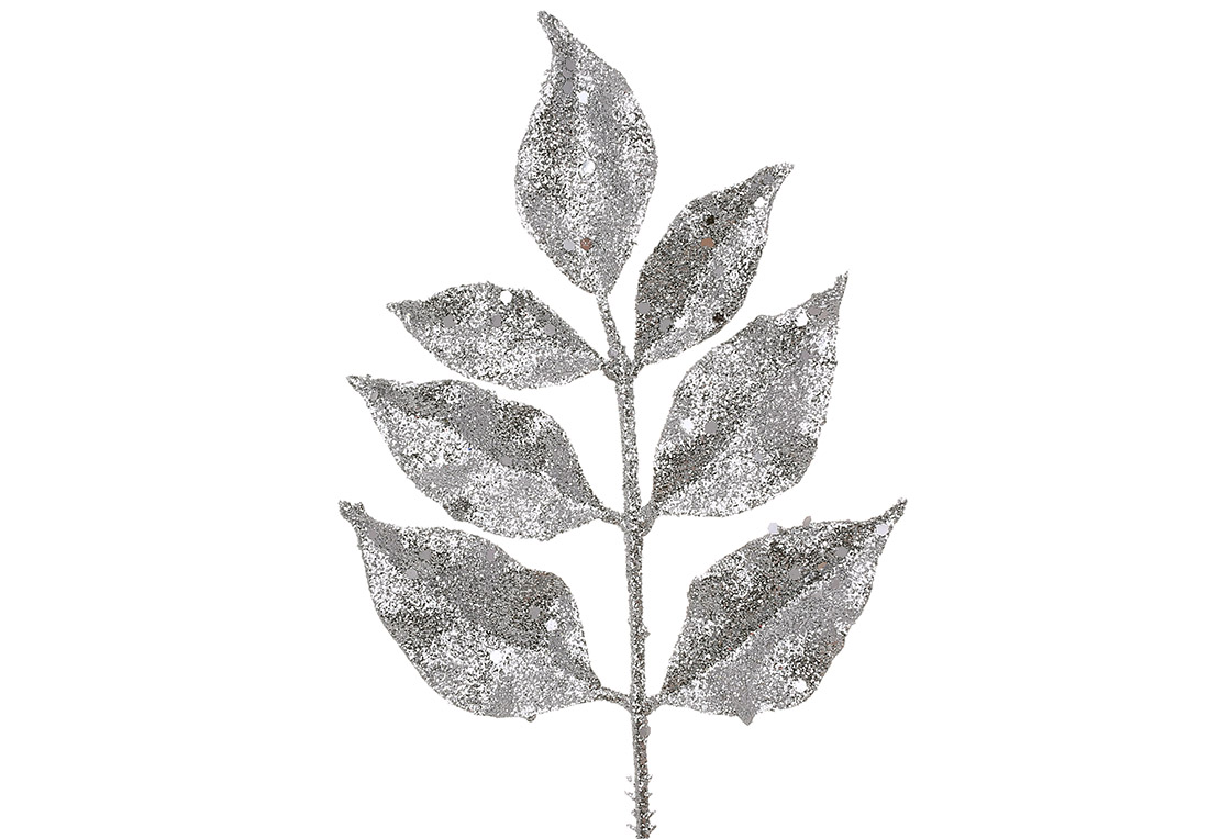 Декоративна гілка ( 3шт ) листя 22см, колір - срібло гліттер