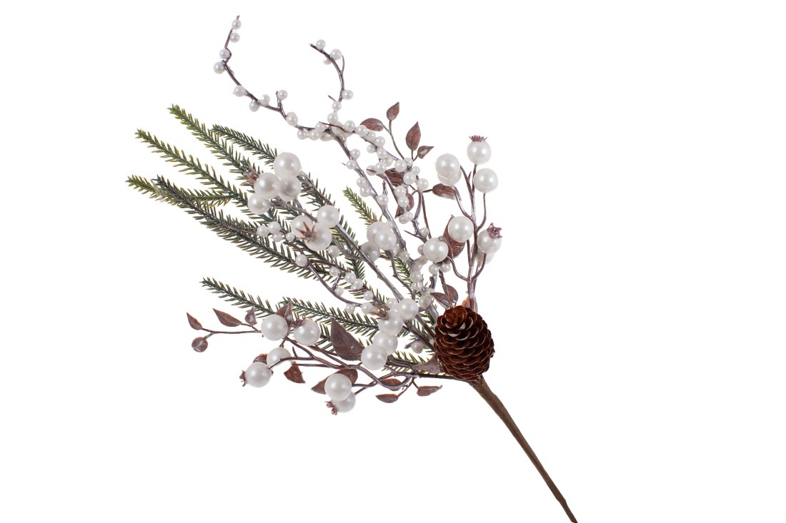 Декоративна гілка з хвої та перламутрових білих ягід, 44см