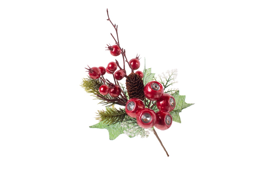 Декоративна гілка з хвої та ягід з кристалом, колір: червоний, 24см