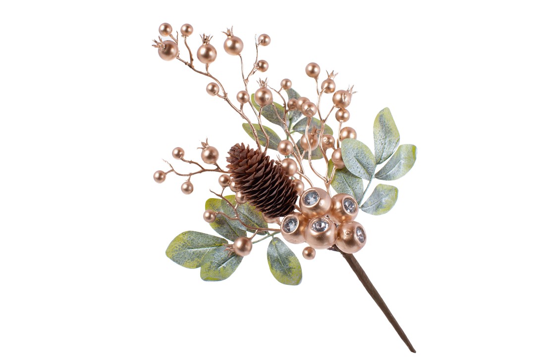 Декоративна гілка з листя та ягід з кристалом, колір: золото, 36см