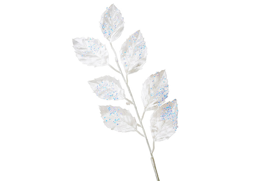 Декоративна гілка листя в паєтках 56см, колір - білий перламутр
