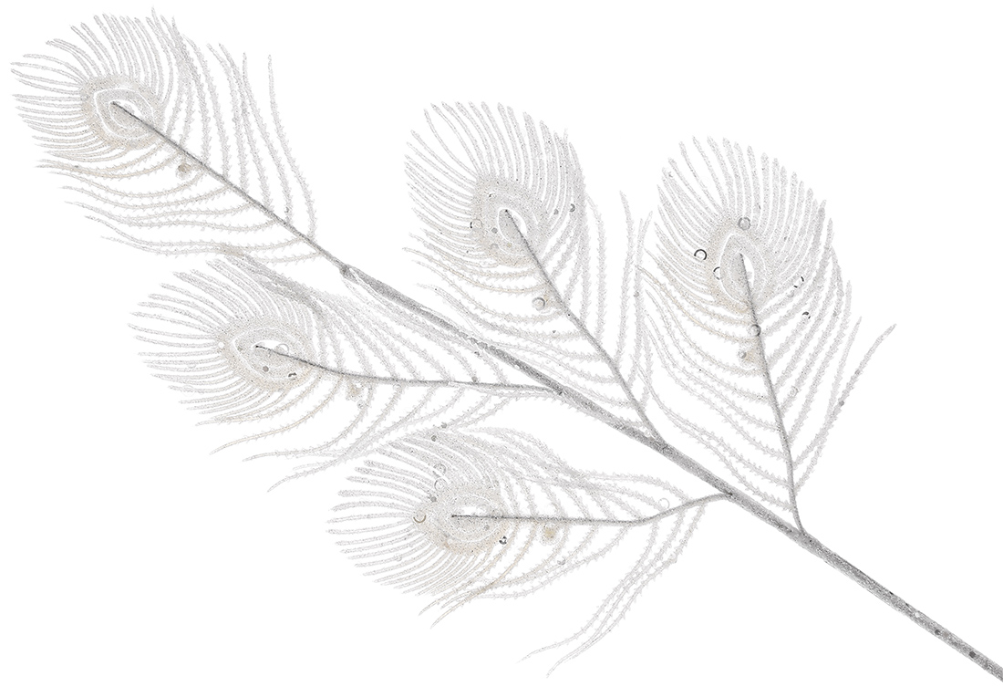 Декоративна гілка Перо Павича (5шт) 70см, колір - білий гліттер