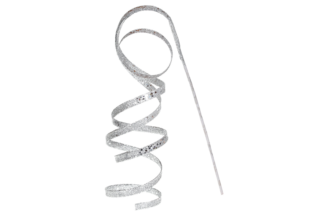 Декоративна гілка з кучерявою стрічкою в гліттері 76см, колір - срібло