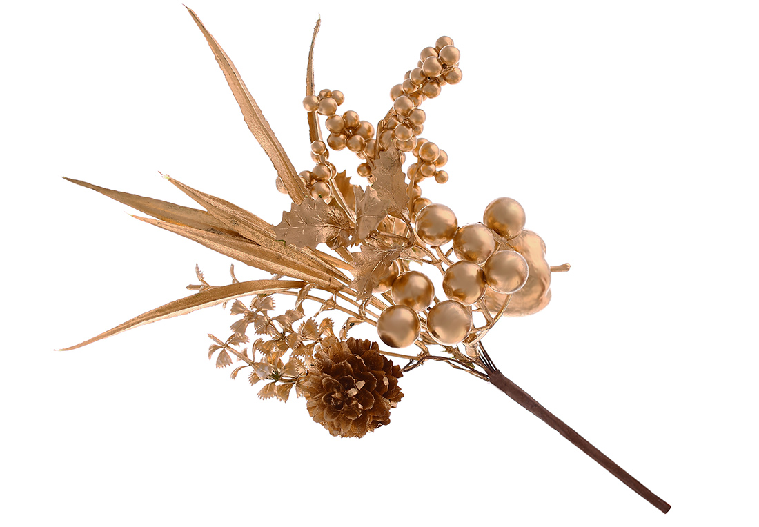 Декоративна гілка з ягодами та листям 27см, колір - матове золото.