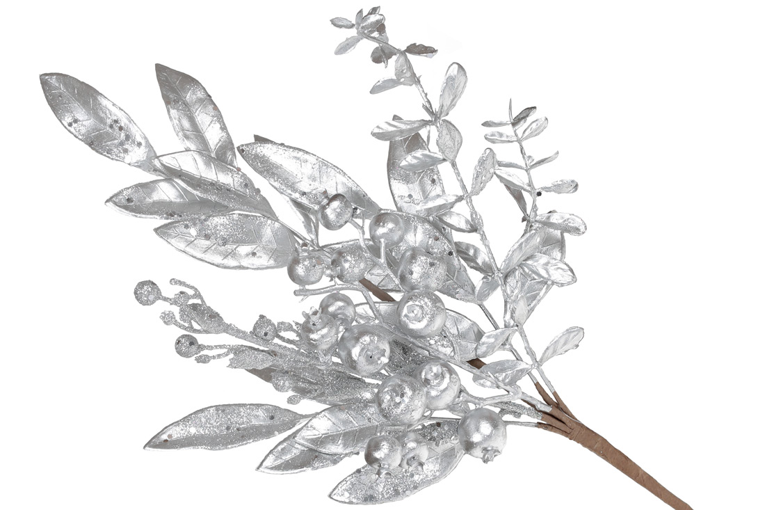 Декоративна гілка з ягодами та листям 53см, колір - матове срібло