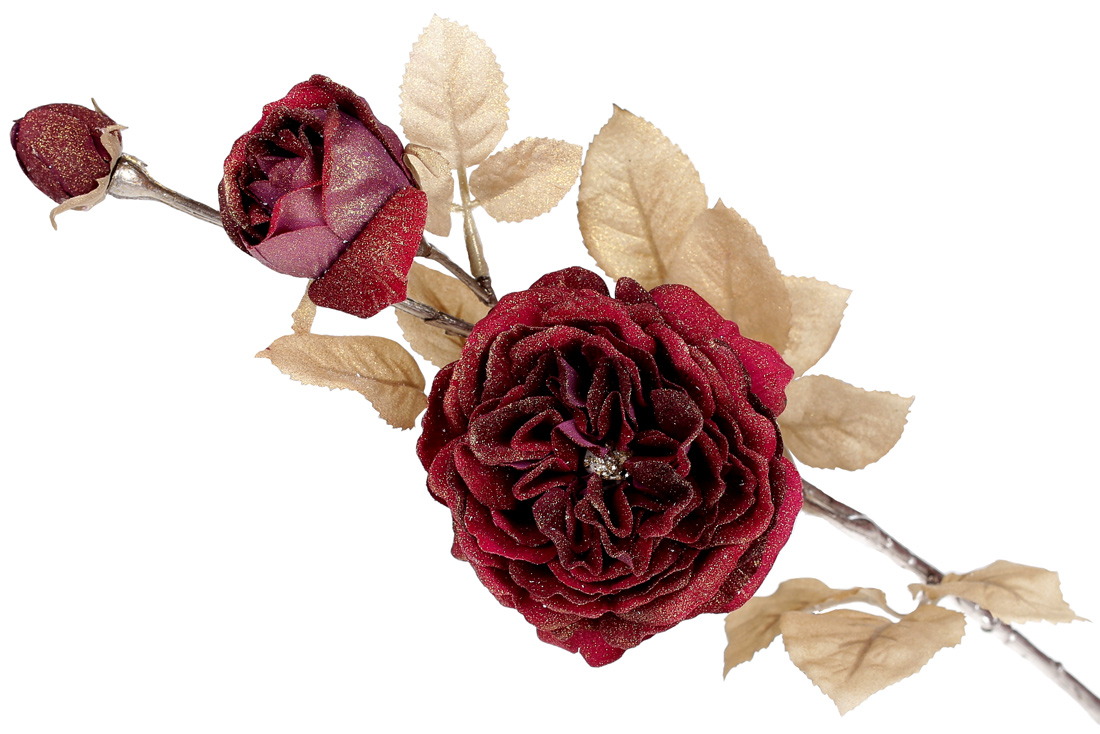 Декоративна гілка з квітами троянд, 58см, колір - бургунді із золотим гліттером