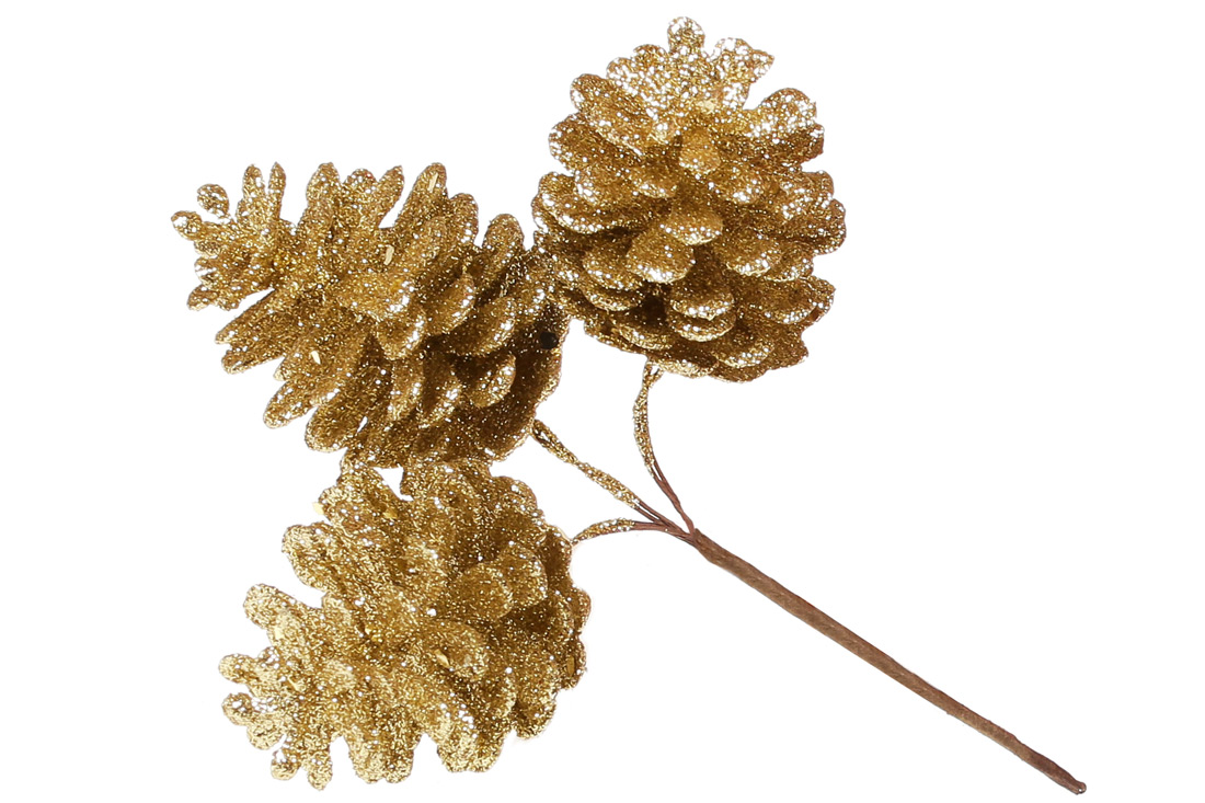 Декоративні шишки, пучок 3 шт, 13см, колір - золото глiттер