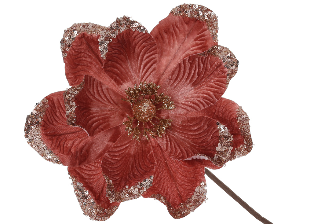 Декоративна квітка Магнолія з оксамиту з гліттером 26см, ніжка 50см, колір - темний персиковий