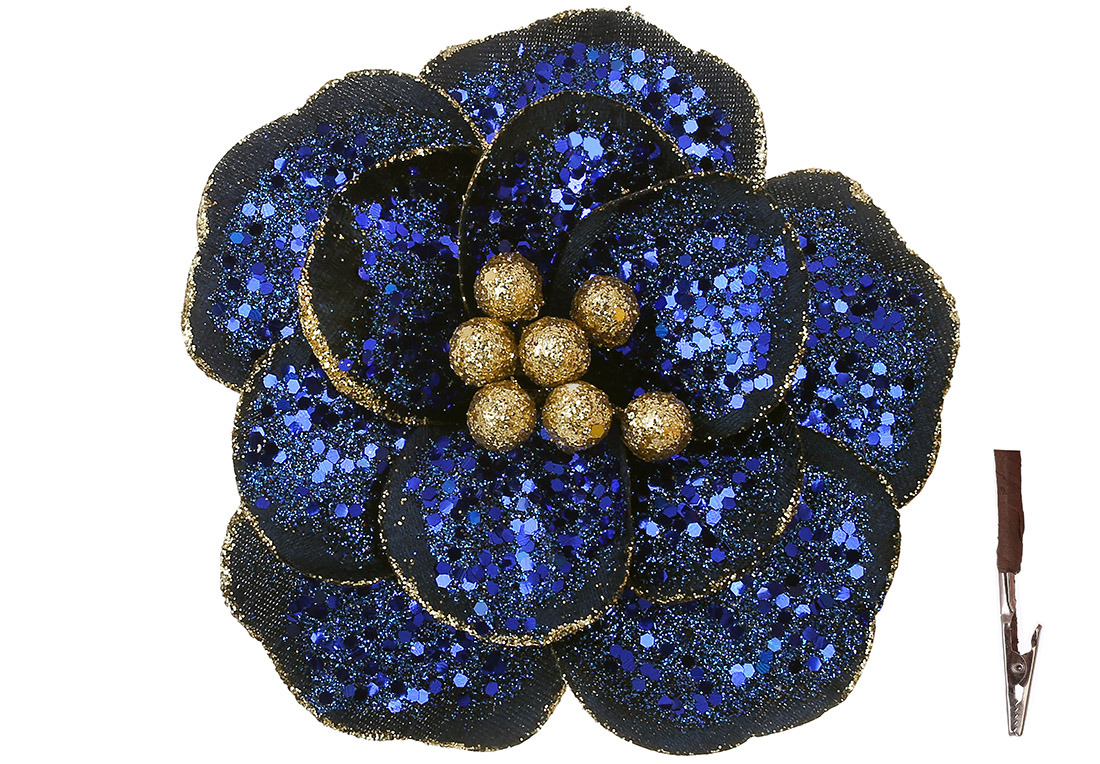 Декоративна квітка Магнолія на кліпсі в паєтках D17см, колір - синій з шампанню