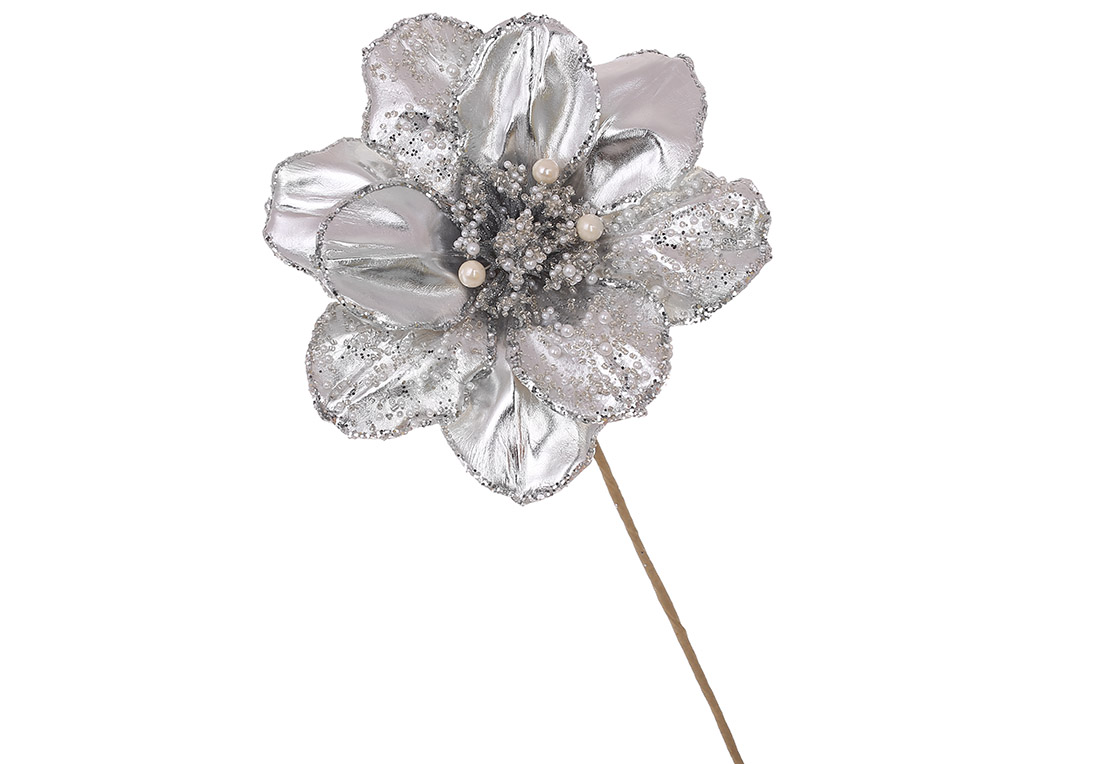 Декоративна квітка Магнолія з бусинами D21см, ніжка 51см, колір - срібло