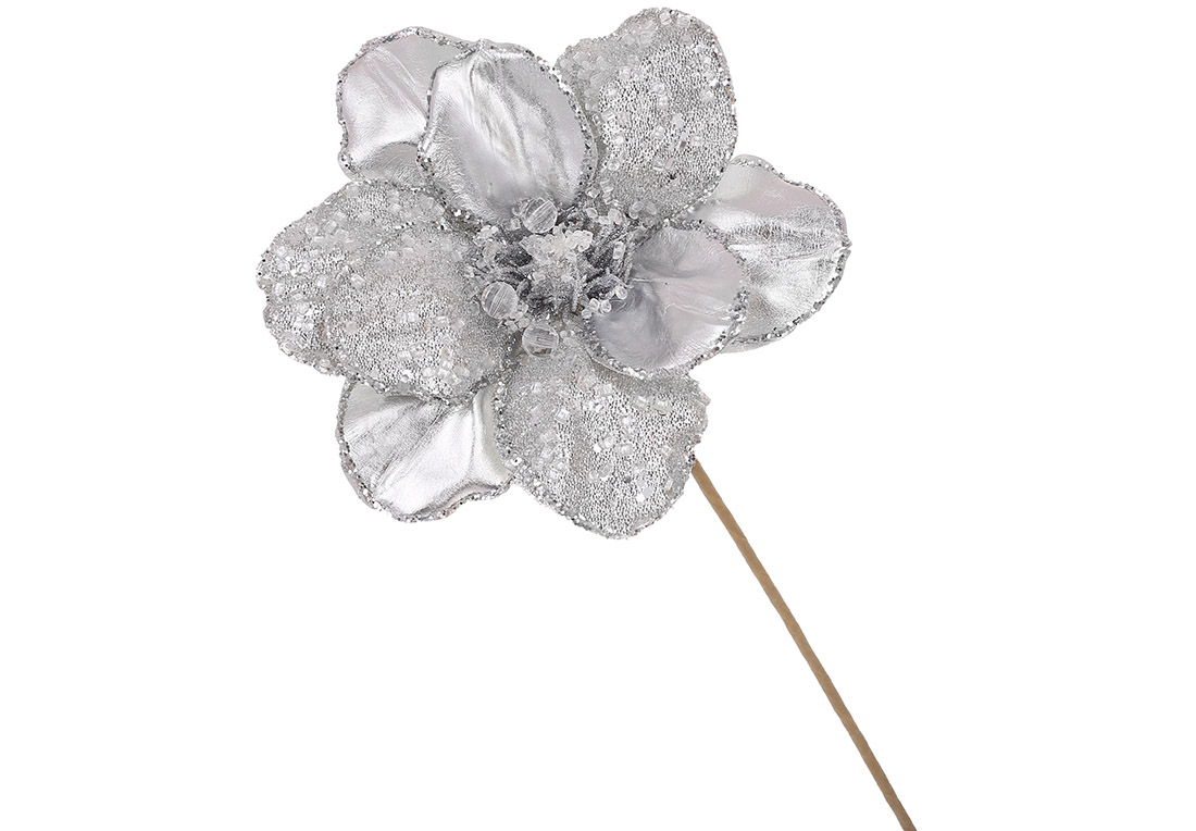 Декоративна квітка Магнолія з бусинами та кристалами D20см, ніжка 50см, колір - срібло