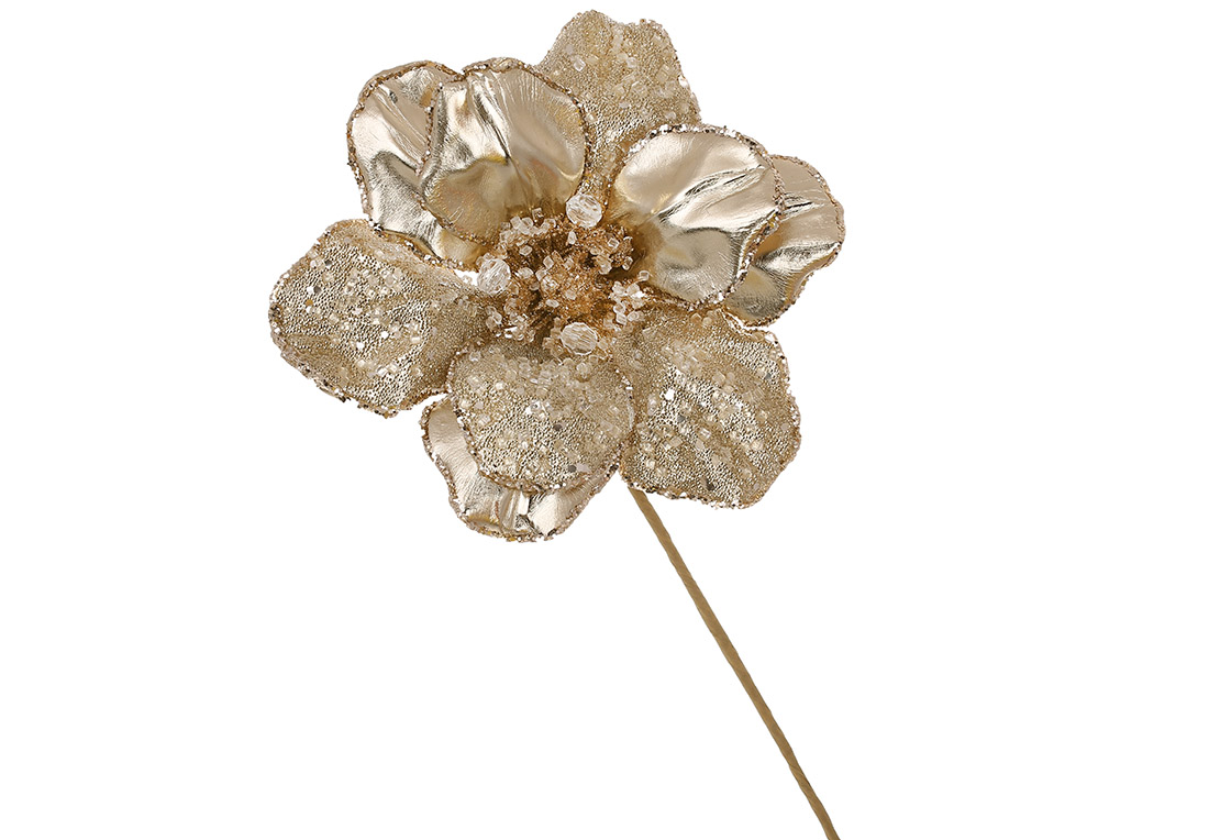 Декоративна квітка Магнолія з бусинами та кристалами D20см, ніжка 50см, колір - шампань