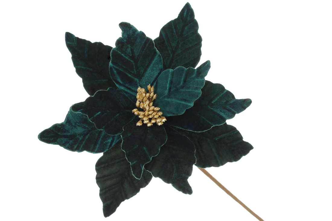 Декоративна квітка Пуансетія з оксамиту 33см, ніжка 50см, колір - глибокий зелений