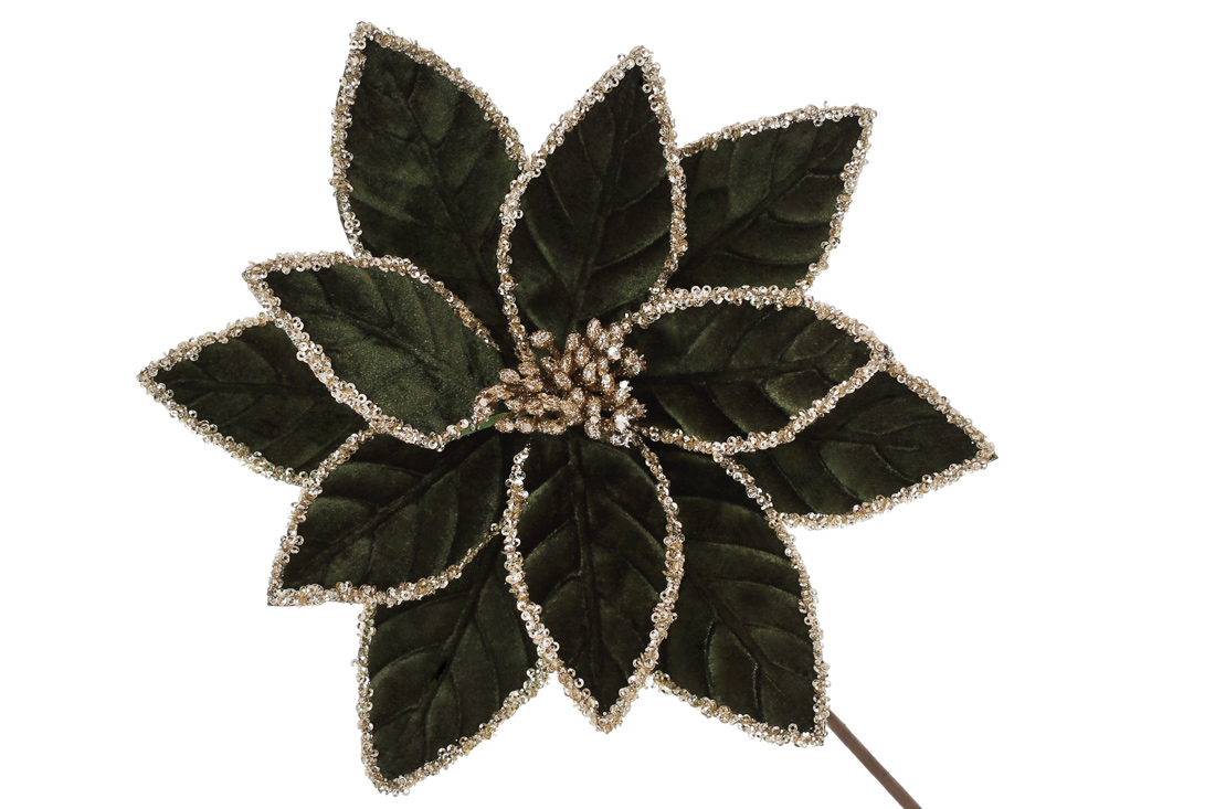 Декоративна квітка Пуансетія з оксамиту з гліттером 28см, ніжка 50см, колір - глибокий зелений