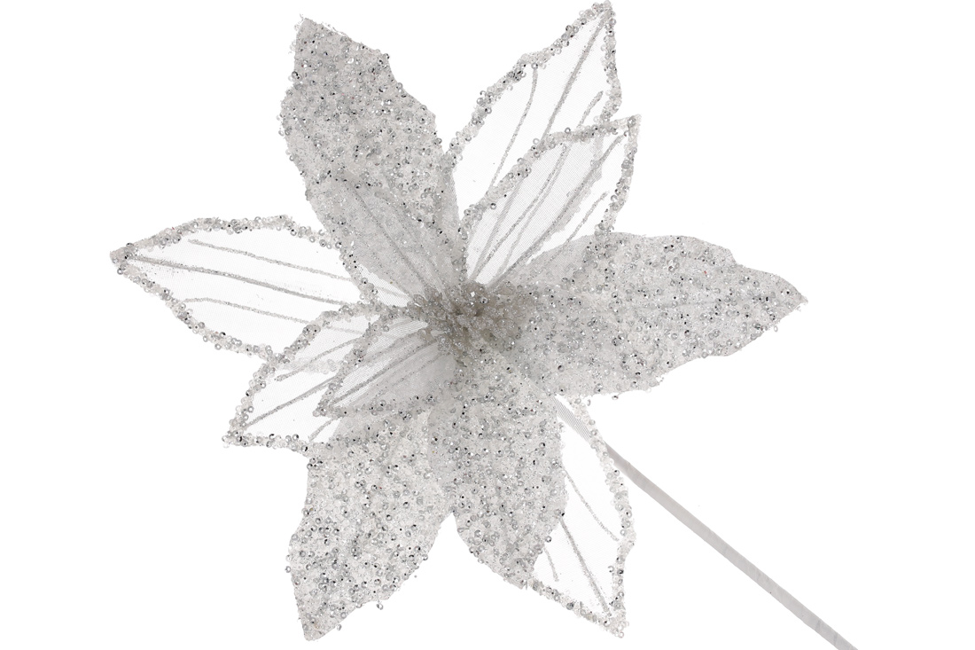 Декоративна квітка Пуансетія з гліттером та бісером 30см, ніжка 50см, колір - білий