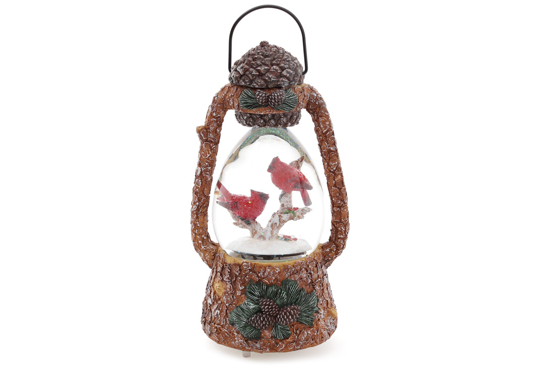 Декоративний ліхтар Кардинали з водяною кулею 23см з музикою "Happy New Year" на заводі, гліттером, що летить, і LED-підсвічуванням на батарейках (2хL