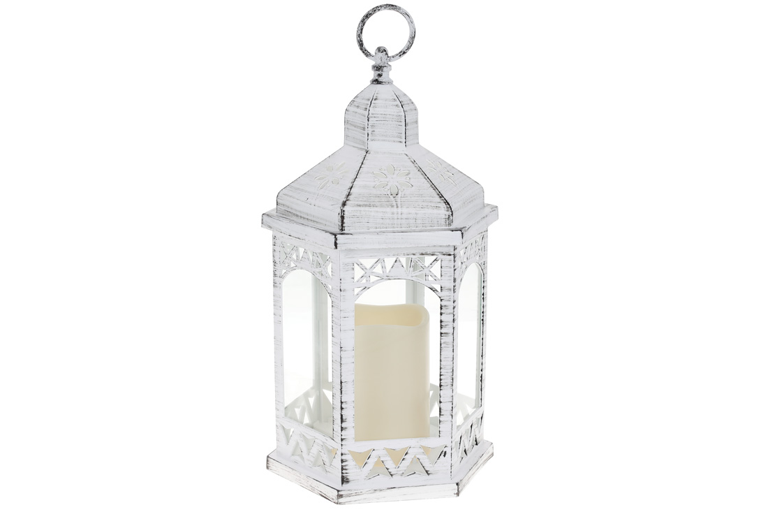 Декоративний ліхтар зі свічкою з LED підсвічуванням (тепле біле світло) на батарейках (3хААА - не входять в комплект), 31см, колір - білий з патиною