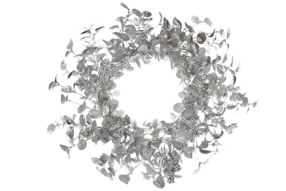 Декоративний вінок з листя та ягід, 70см, колір - срібло