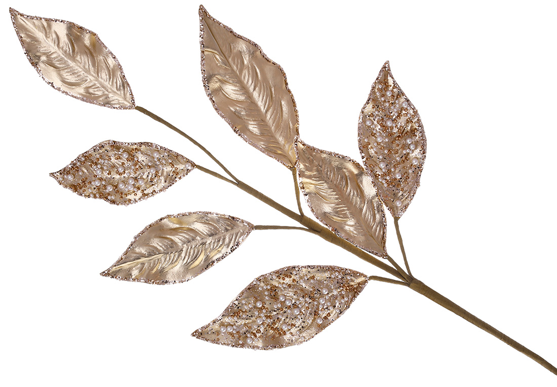 Декоративна гілка листя з перлинними намистинами та гліттером 70см, колір - шампань.